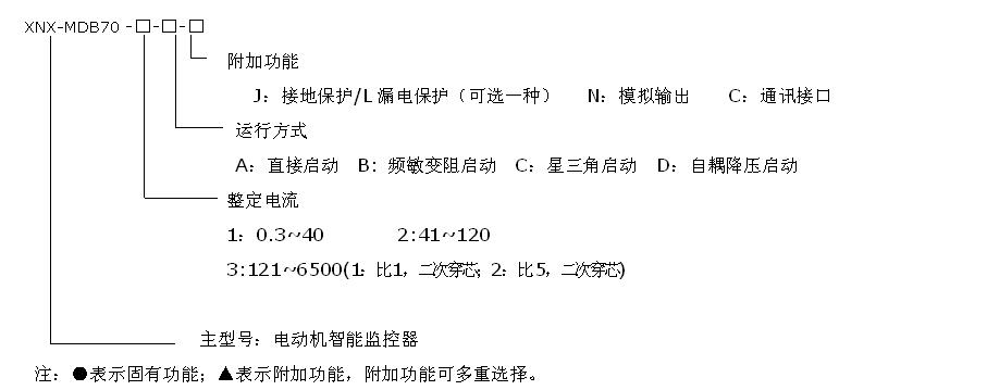 XNX-MDB70系列電動機智能監(jiān)控器是一款智能化、數字化、網絡化的控制器。該產品基于微處理器技術,將網絡通訊技術和分布式智能技術溶入MCC控制中心,集電機智能保護、運行狀態(tài)監(jiān)控、故障記錄及網絡通訊為一體;可以查看測量數據、報警信息、故障信息等,并可根據用戶需要方便的進行保護參數設定。能滿足諸多啟動方式,在低壓控制終端MCC柜和1/4單元及以上各種抽屜柜中可直接安裝使用。 二、型號說明